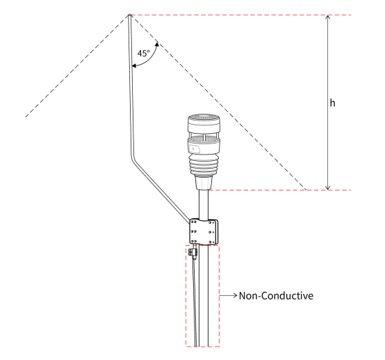 · Fixed Rod Height: If the height of the air terminal is predetermined, the sensor must be moved horizontally closer to the mast to ensure it sits within the 45° protection cone.